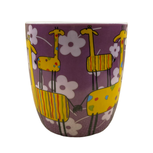 Features artwork wrapping around its exterior surface and on the handle depicting flowers and whimsical giraffes.