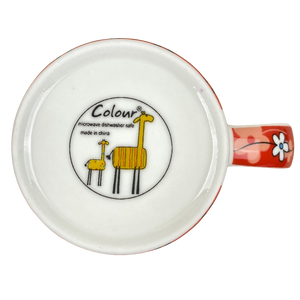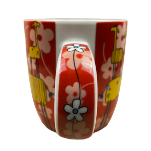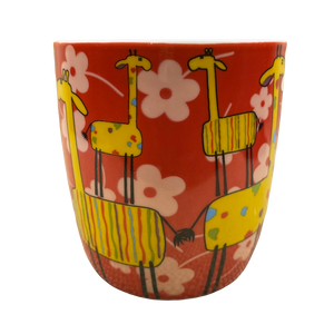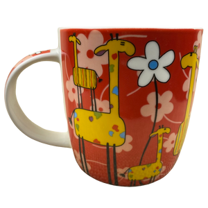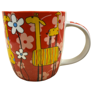 Features artwork wrapping around its exterior surface and on the handle depicting flowers and whimsical giraffes.