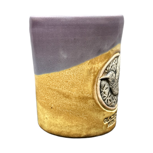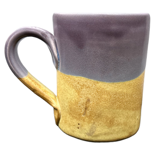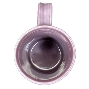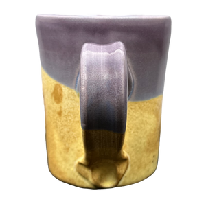 This mug has a two tone design with the majority of it being tan and the upper portion being a light shade of purple. The light purple portion continues on to the upper part of the handle and the entire interior.