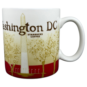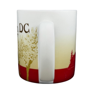 This official Starbucks Collector Series Washington DC ceramic mug features a sophisticated wrap-around design that pays tribute to the historic landmarks of the nation's capital. The exterior beautifully depicts the Washington Monument framed by elegant cherry blossom trees in bloom, alongside a detailed red illustration of the United States Capitol Building. The mug is finished with a striking, deep red interior glaze that provides a bold contrast to the cream-colored ceramic body. Holding 16 fluid ounces, this durable stoneware piece is both microwave and dishwasher safe, making it a perfect memento for travelers or a classic addition to any coffee lover's collection.