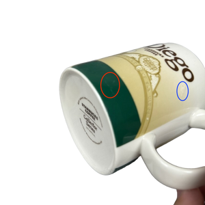 There is a manufacturing imperfection on the front surface under and to the right of the letter "O" in "Diego" Please see the blue oval surrounding this in the last photo, This can also be seen in the 360 photo.