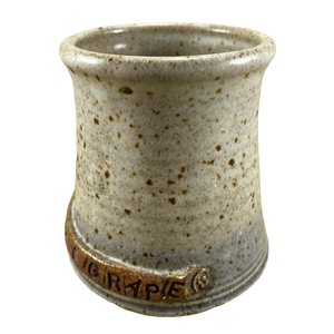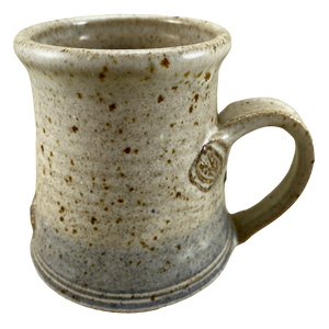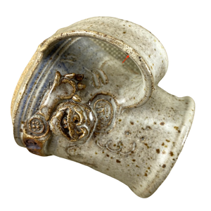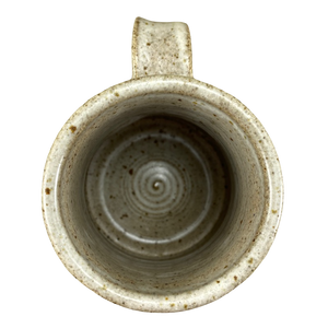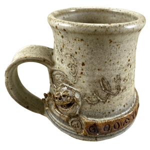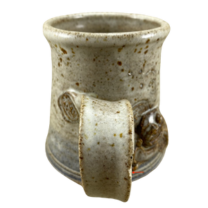 This is a highly unusual mug with a hand thrown appearance and embossed details on its exterior surface.