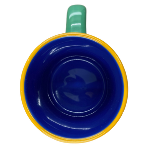 Also has orange trim on the rim and a blue interior.