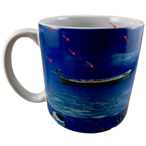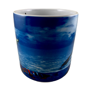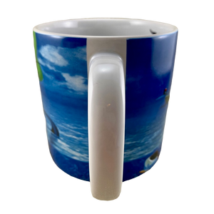 This is an awesome oversized mug that has terrific artwork wrapping completely around its exterior surface. This artwork consists of water and the sky. There are also fish underwater and clouds in the sky.