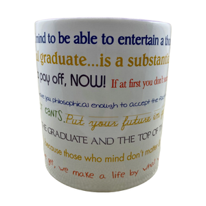 Features multiple phrases talking about the graduate and their future wrapping around its exterior surface.