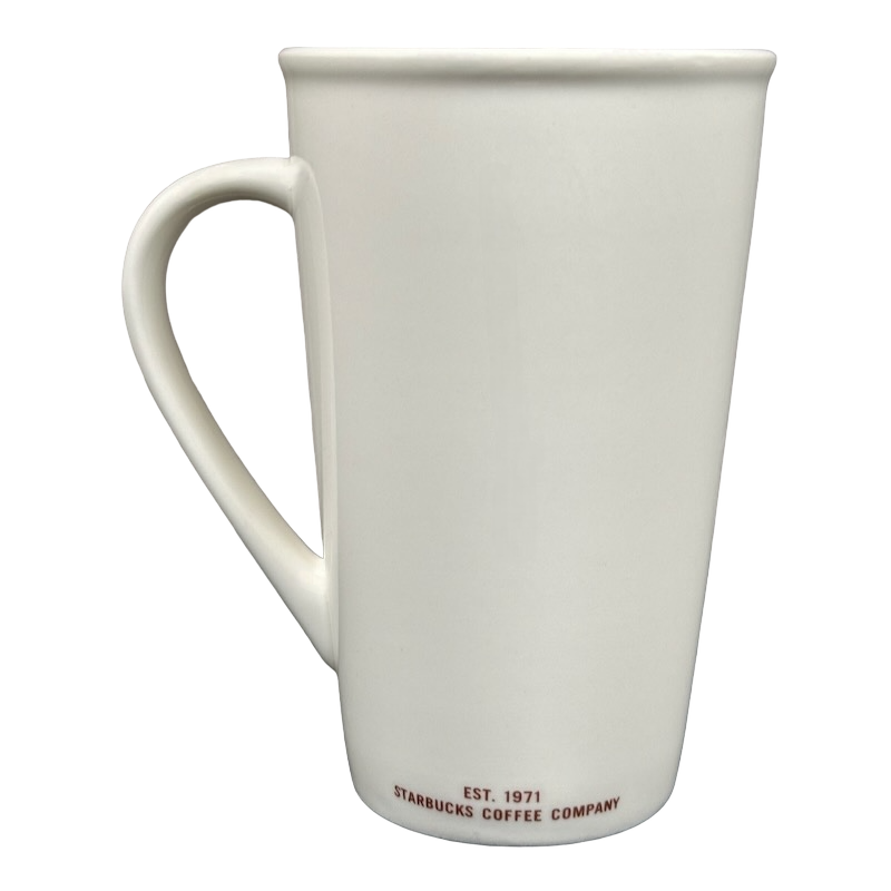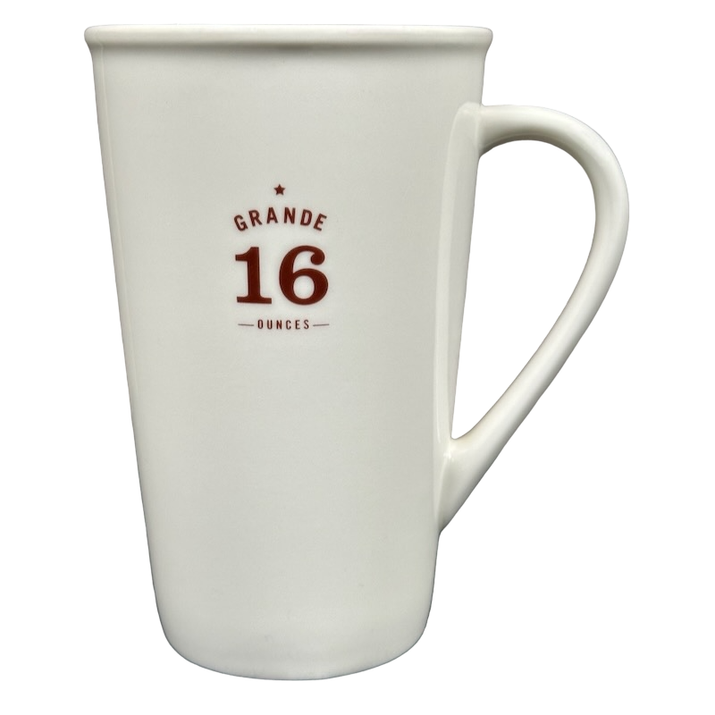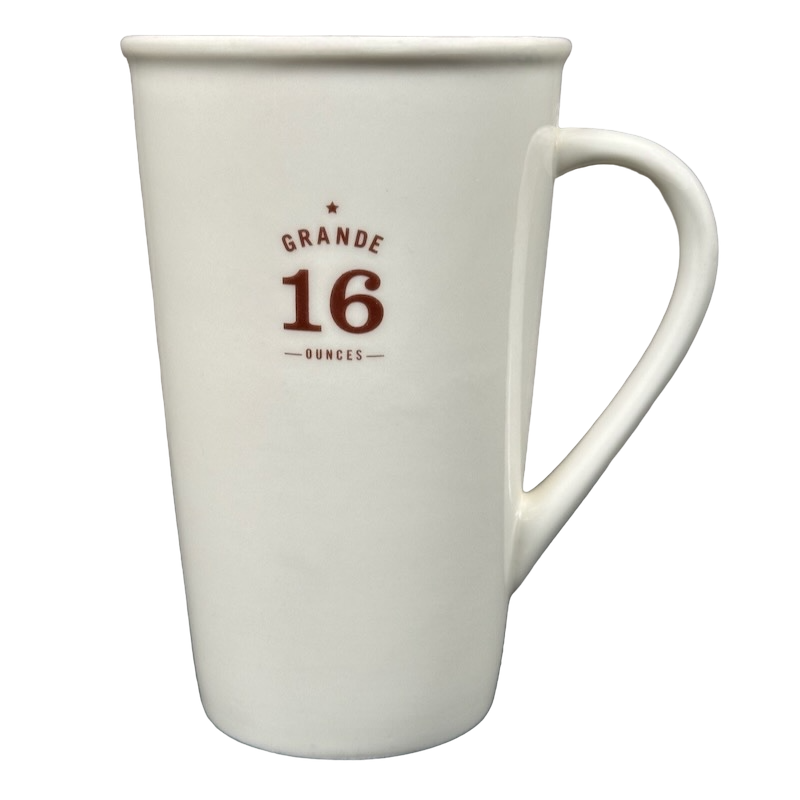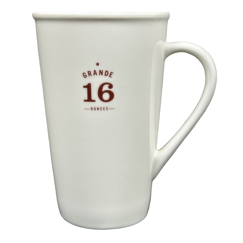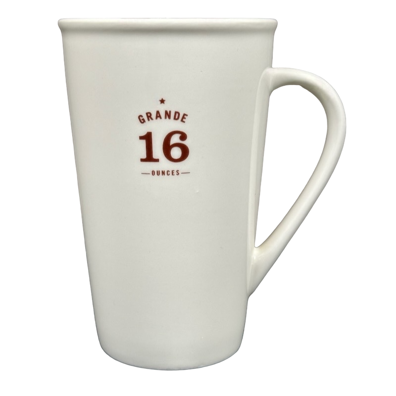 This clean and modern 16-ounce Starbucks mug features a minimalist matte-white finish accented with deep red lettering that highlights its GRANDE 16 OUNCES capacity on the front. The tall, tapered silhouette and gently flared rim give it a refined café look, while the elongated curved handle provides a comfortable and balanced grip. A small EST. 1971 – Starbucks Coffee Company mark sits along the lower back edge, adding a subtle tribute to the brand’s heritage.