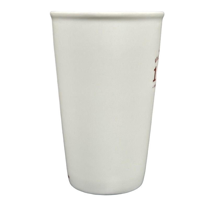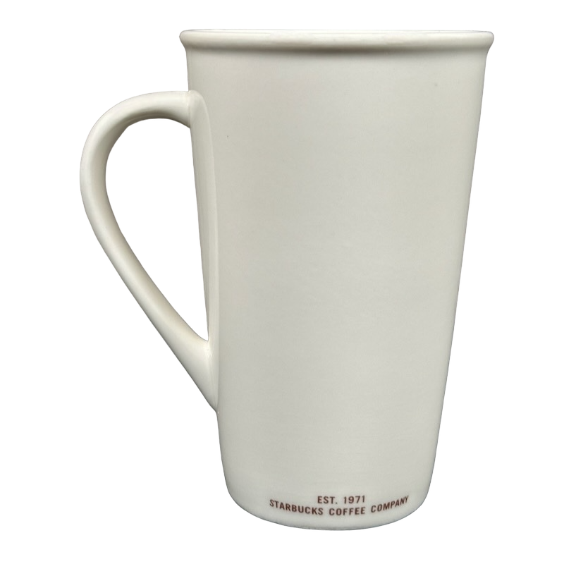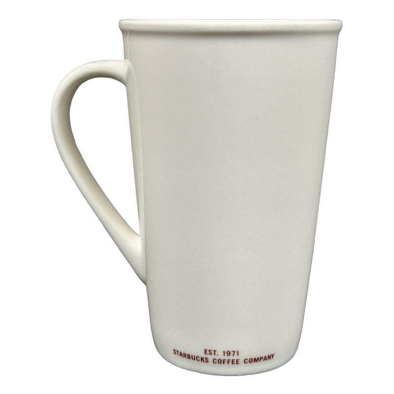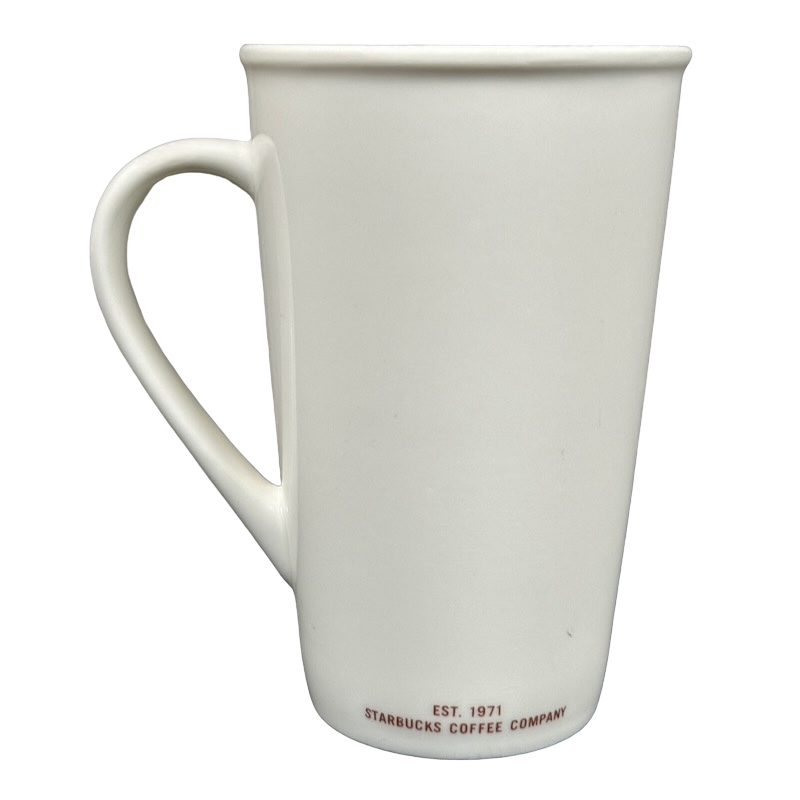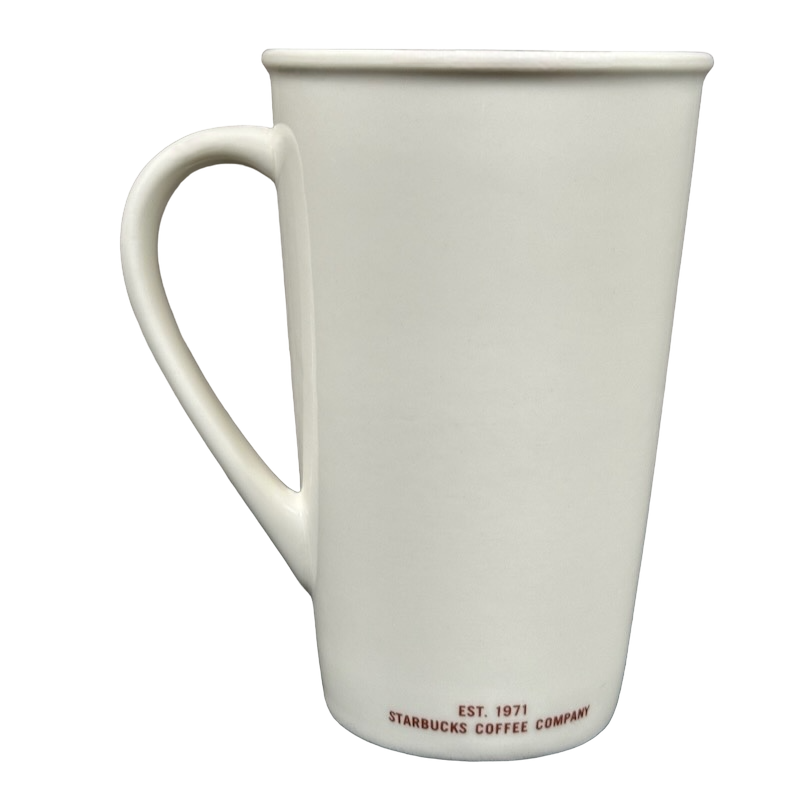 This clean and modern 16-ounce Starbucks mug features a minimalist matte-white finish accented with deep red lettering that highlights its GRANDE 16 OUNCES capacity on the front. The tall, tapered silhouette and gently flared rim give it a refined café look, while the elongated curved handle provides a comfortable and balanced grip. A small EST. 1971 – Starbucks Coffee Company mark sits along the lower back edge, adding a subtle tribute to the brand’s heritage.