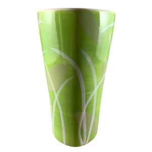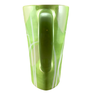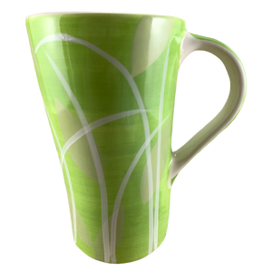 This is a very tall mug with an extremely unique shape. It features a pattern of grass and leaves wrapping around its exterior surface.