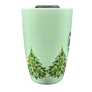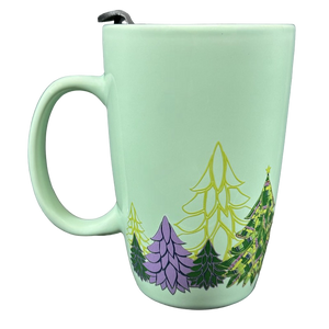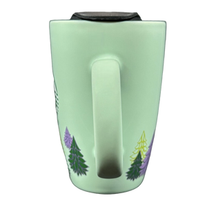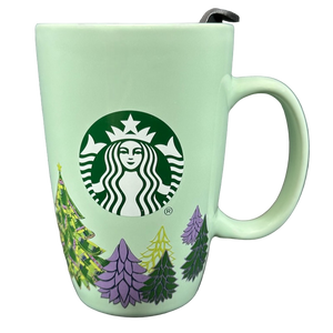 Underneath the Siren and wrapping around the mug's exterior surface are lavender, green, yellow, and multicolor Christmas trees.