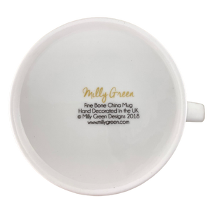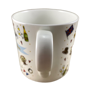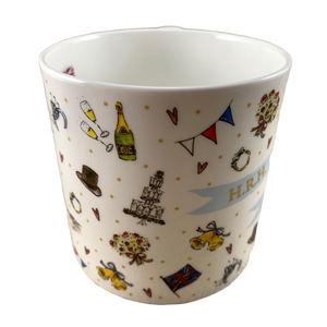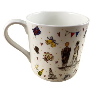 This mug features artwork wrapping around its exterior surface relating to a wedding.