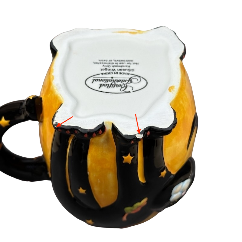 There is a small chip on one of the cat's toes and a tiny nick on another on the front surface. please see the red arrows pointing to these in the last photo.