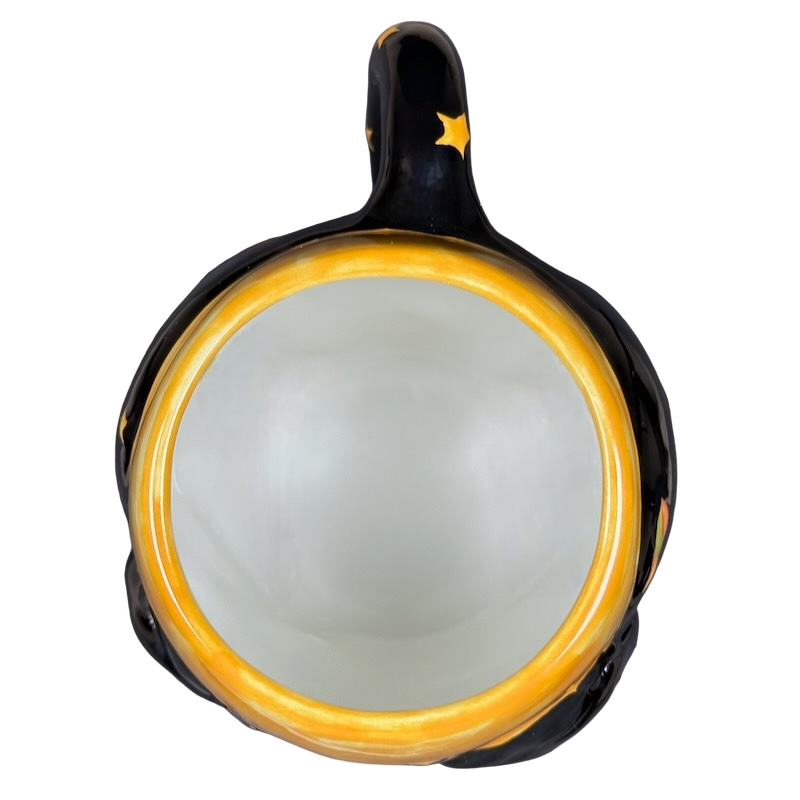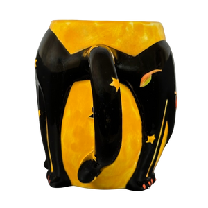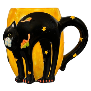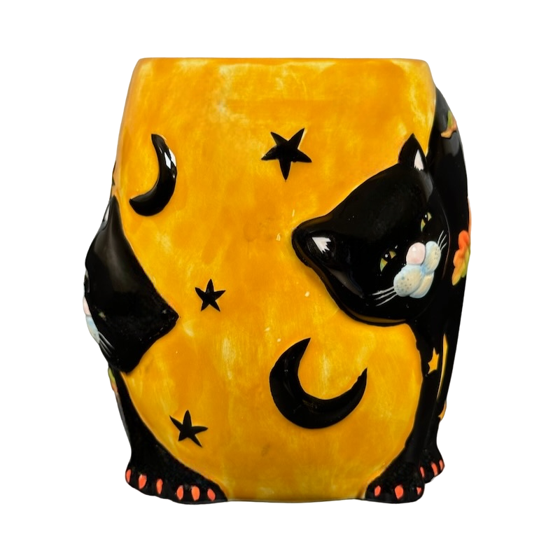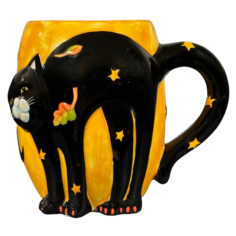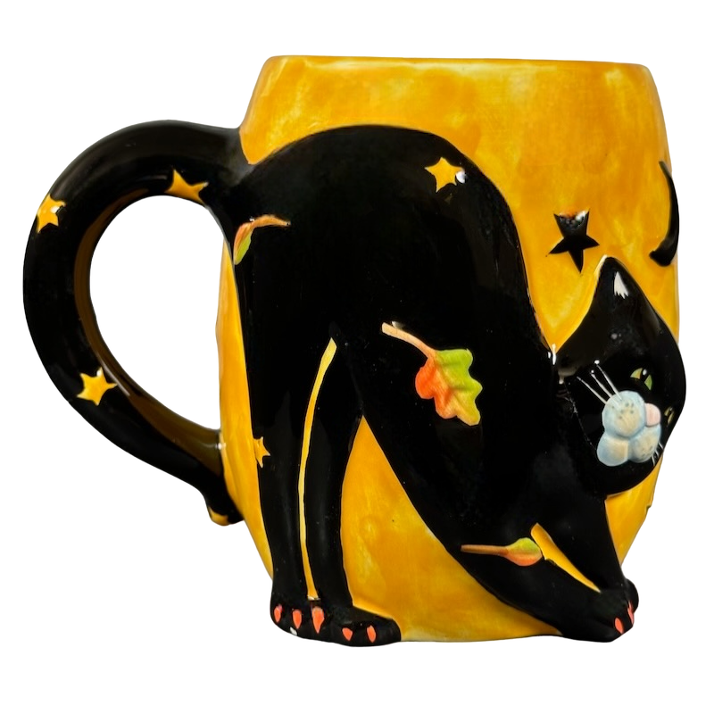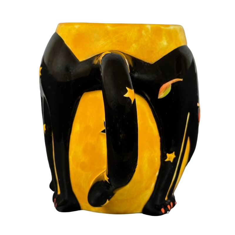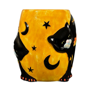 Features a 3D figural design of a black cat in diffferent poses on its front and rear surface.