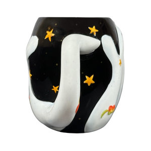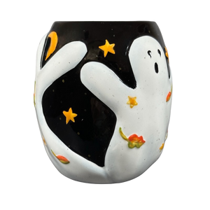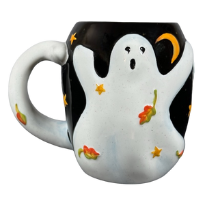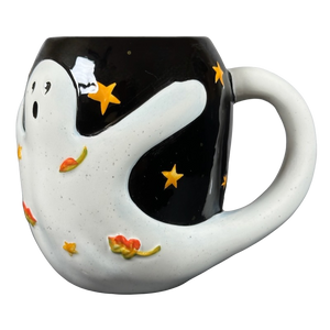 Features a 3D figural design of a flying ghost surrounded by fall leaves and orange stars.