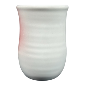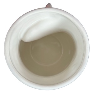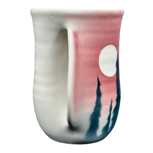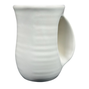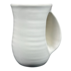 This mug features a hand warmer handle where your right hand fits inside it so that the warm beverage in the mug will warm your hand.