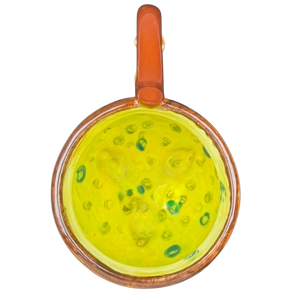 This whimsical handmade pottery mug is shaped like a vibrant orange witch's cauldron, complete with three black feet and a unique handle designed to look like a broomstick. The exterior features a glossy orange finish, while the interior surprises with a bright lime green "bubbling brew" glaze accented by darker green spots. Crafted with artisan detail, the base reveals hand-painted markings and teal accents on the feet, making it a standout collectible for Halloween or any fan of the mystical. Its rounded, pot-bellied silhouette and sculptural elements ensure it is as much a decorative art piece as it is a functional vessel for your favorite seasonal drinks.
