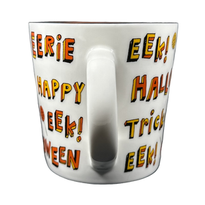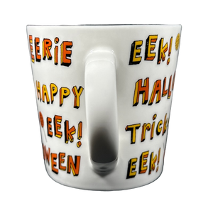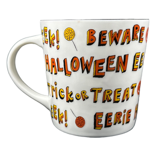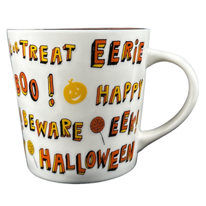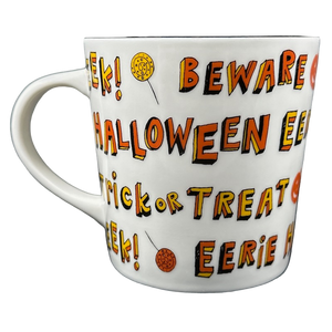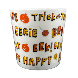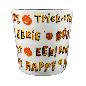 Features several Halloween related words, phrases, and images wrapping around the exterior surface.