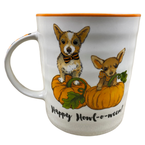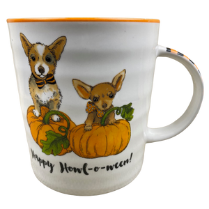Features the same artwork on its front and rear surface consisting of a pair of Chihuahua dogs atop pumpkins.