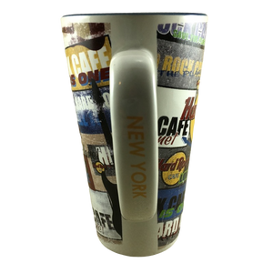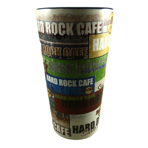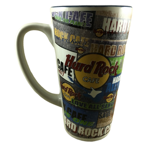 Artwork wrapping around this mug features various Hard Rock Cafe logos.