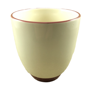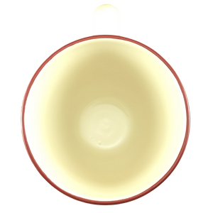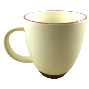 Also features a thin line of red trim on top of the rim and a much thicker band around the exterior of the base.