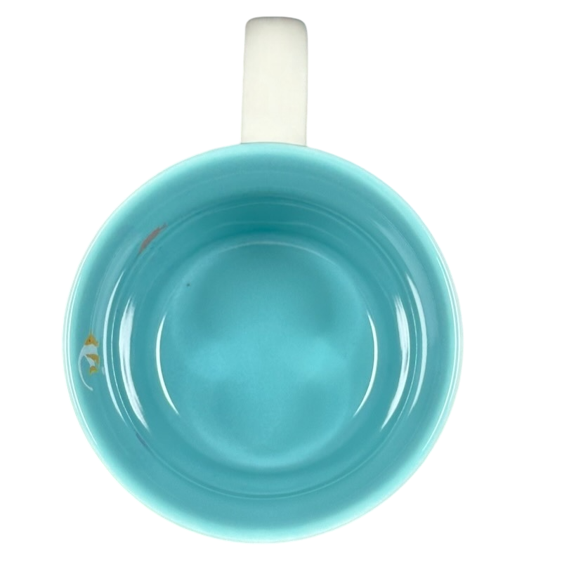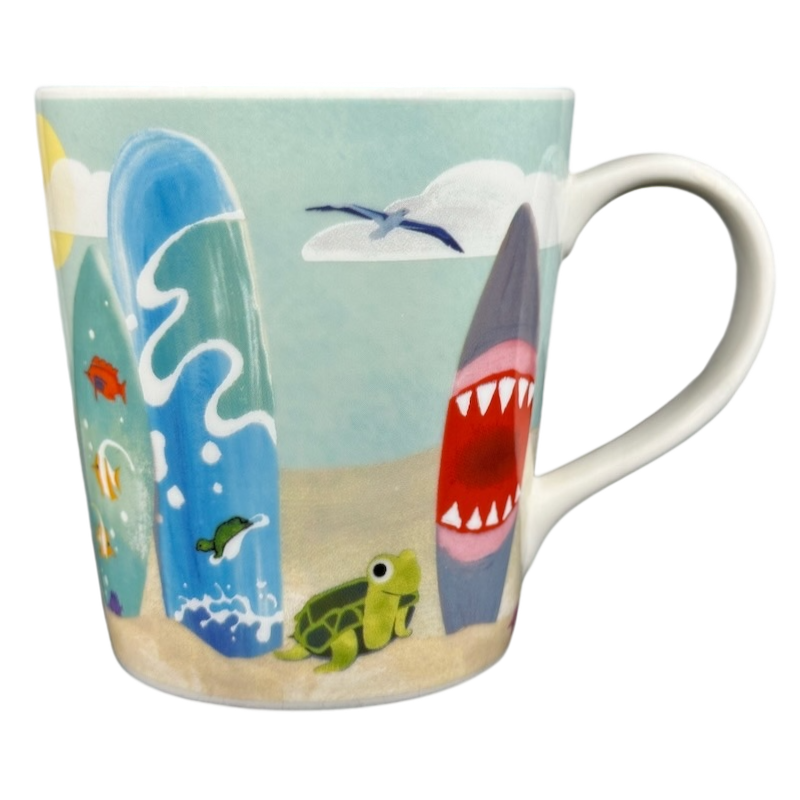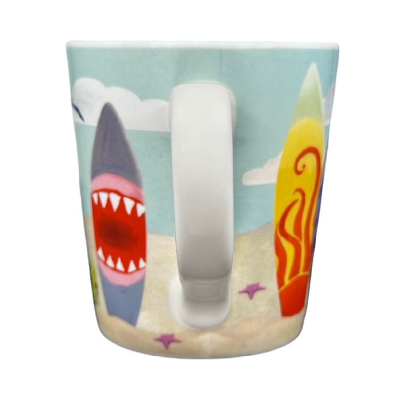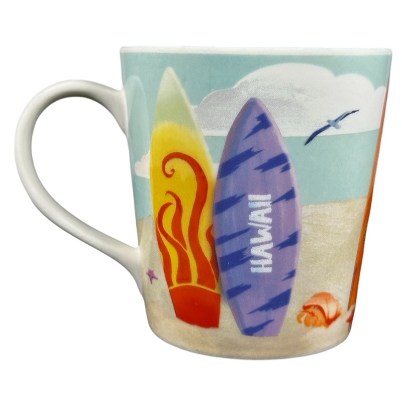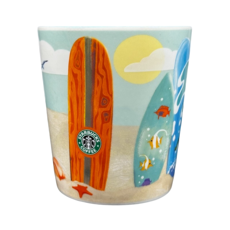 This mug showcases surfboards and a beach scene encircling its exterior. Inside, three fish are depicted on the upper surface. One surfboard displays "HAWAII" vertically, while another features the iconic Starbucks Siren.