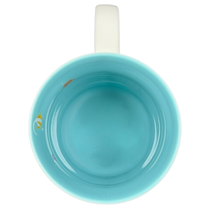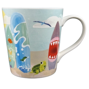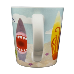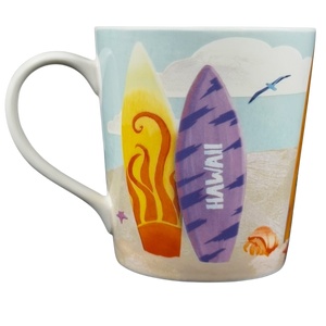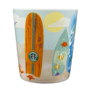This mug showcases surfboards and a beach scene encircling its exterior. Inside, three fish are depicted on the upper surface. One surfboard displays "HAWAII" vertically, while another features the iconic Starbucks Siren.