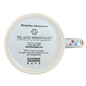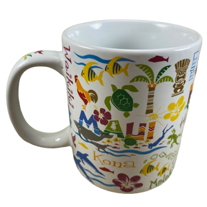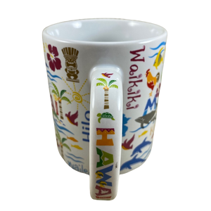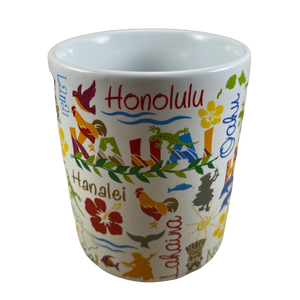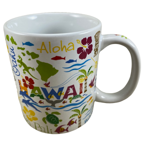 Features artwork wrapping around its exterior surface depicting many different images and words relating to Hawaii.