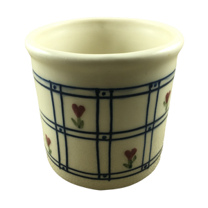 Features red heart flowers scattered in a blue grid wrapping around its exterior surface.