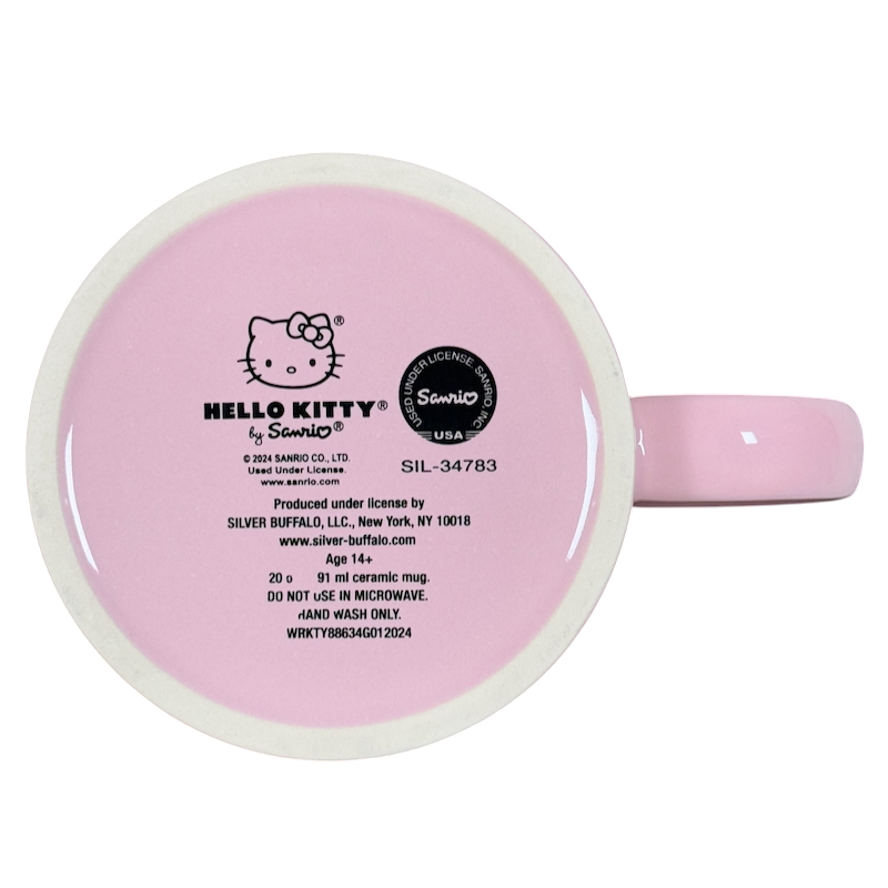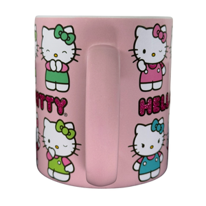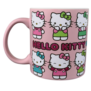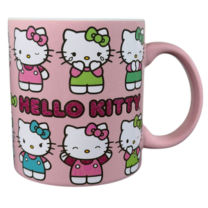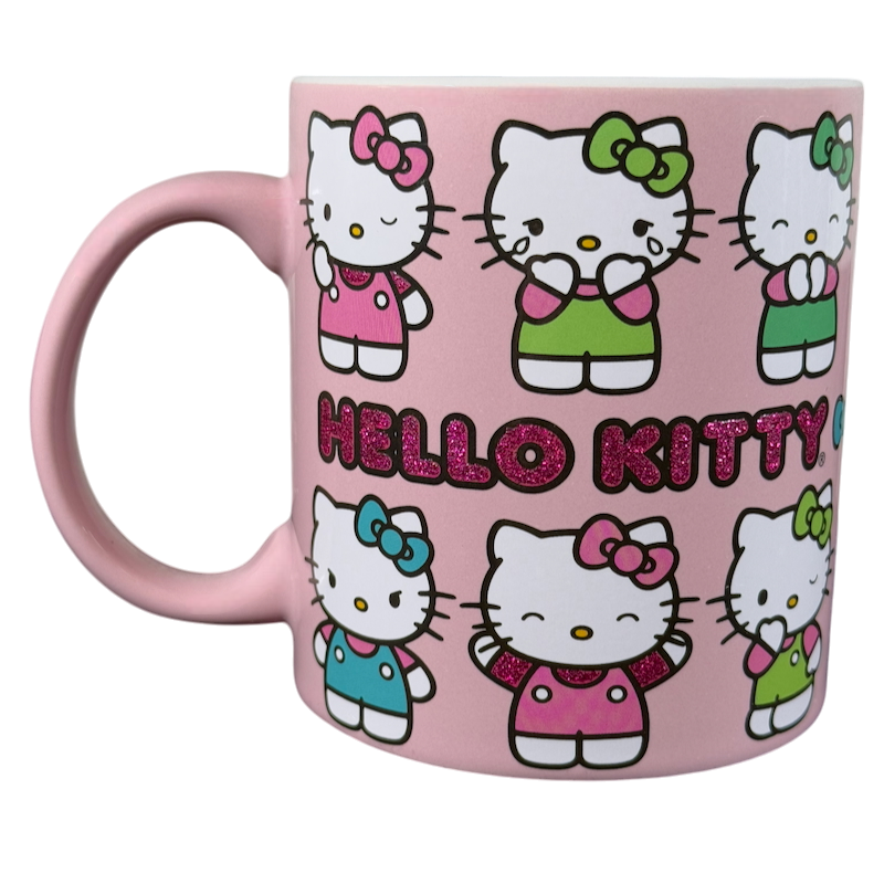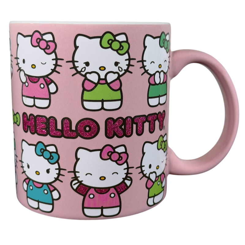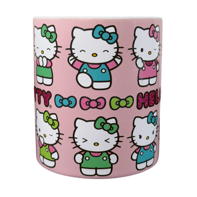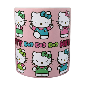 Features Hello Kitty displaying multiple expressions wrapping around its exterior surface.