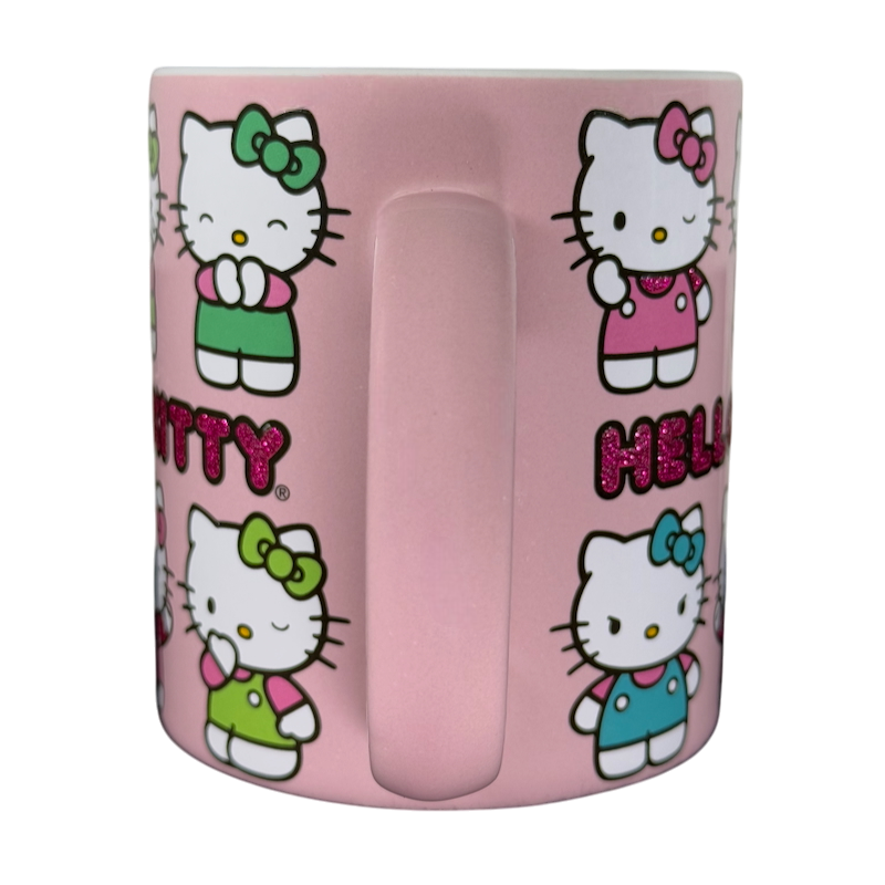 Centered on the front and rear surface in a pink glitter font is "HELLO KITTY."
