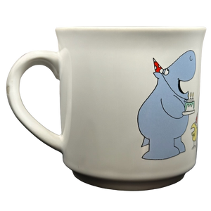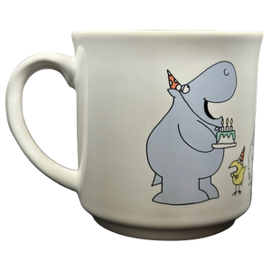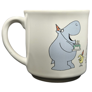 On the rear surface are several animals wearing party hats including a hippo holding a cake.