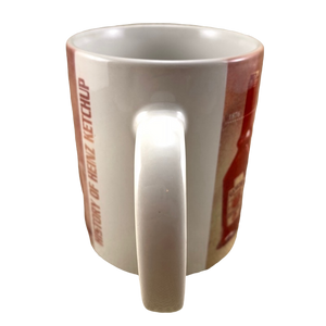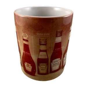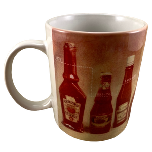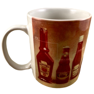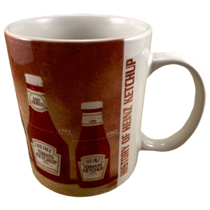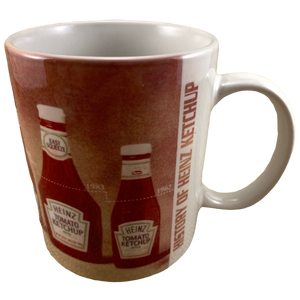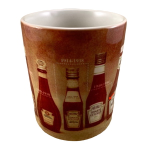 This is an awesome rare mug that features a timeline of Heinz Ketchup bottles from 1876 to 1962.