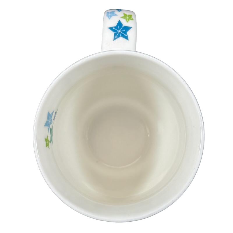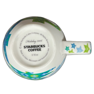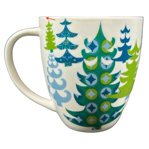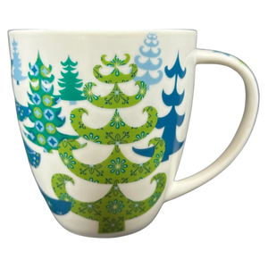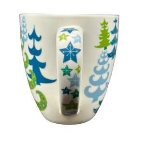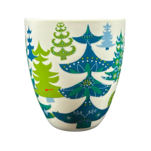 Features Christmas trees wrapping around its exterior surface and snowflakes on the handle.