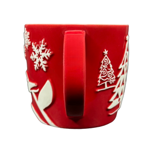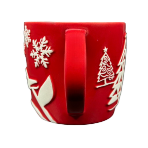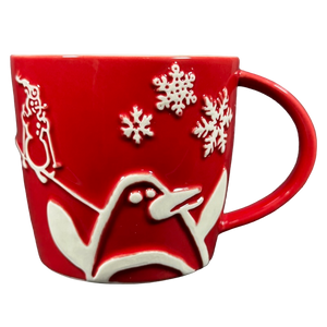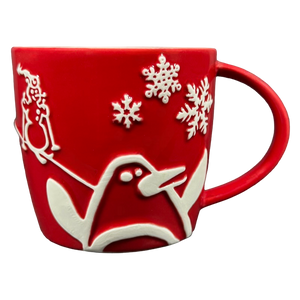 Features an embossed penguin, a snowman skiing, trees, and snowflakes wrapping around its exterior surface.
