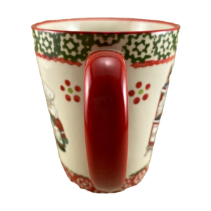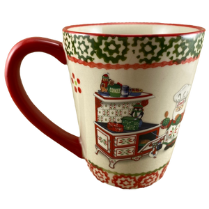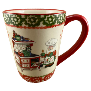 Features the same artwork on its front and rear surface consisting of Santa standing in front of an oven baking.