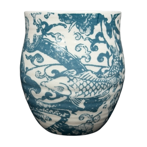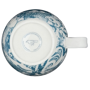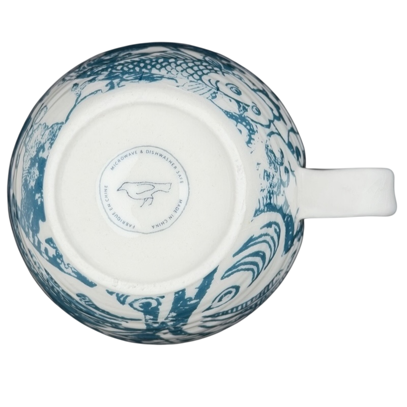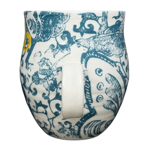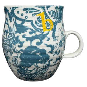 This Anthropologie ceramic mug showcases a striking blue-and-white design inspired by classic Asian porcelain patterns. The exterior is richly decorated with flowing koi fish, stylized clouds, and ornate decorative elements rendered in a deep teal-blue glaze against a soft cream background. A small lowercase “b” in warm yellow appears near the upper exterior, serving as a subtle decorative accent that adds contrast and visual interest. The gently rounded body and slightly tapered rim create an elegant yet approachable silhouette, paired with a smooth white handle that offers a comfortable grip.