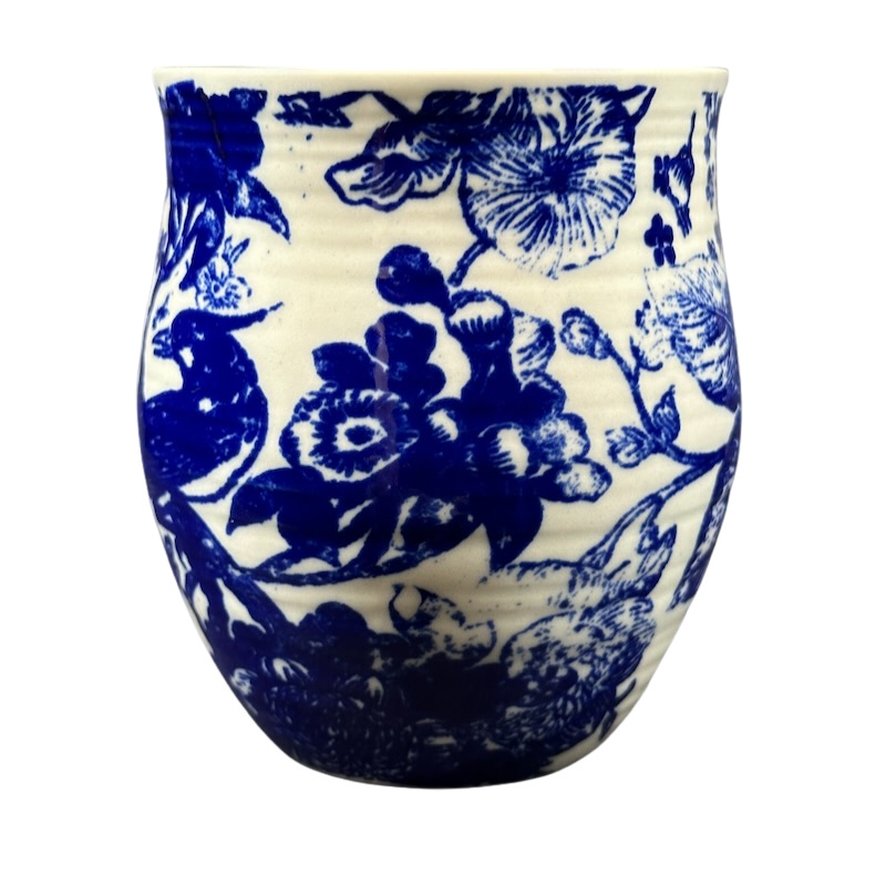 Features a floral pattern wrapping the exterior surface with the letter "k" printed on the upper front surface.