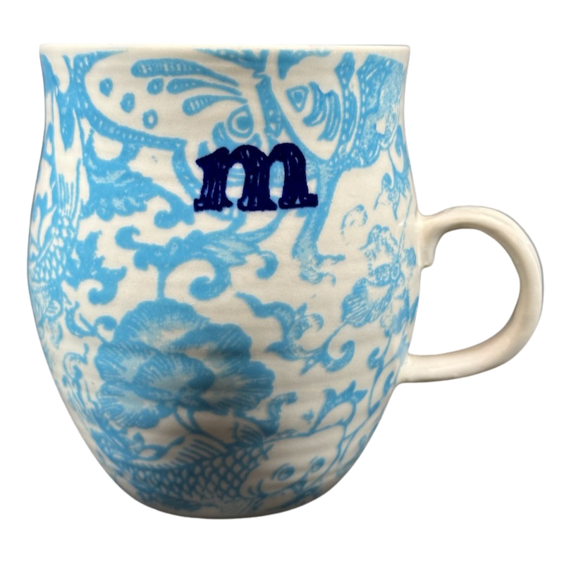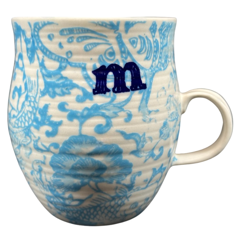 Features an abstract pattern wrapping around its exterior surface with the letter "m" printed on the front upper surface.