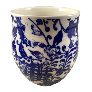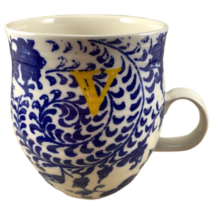 Features a floral pattern wrapping around its exterior surface with the letter "v" printed on the upper front surface.