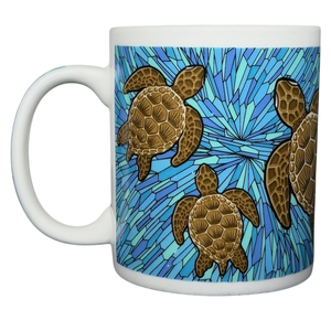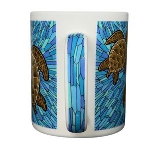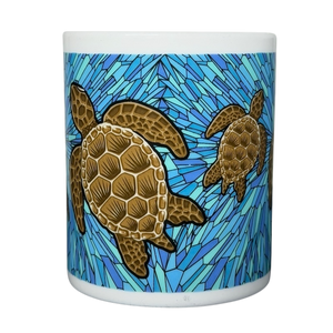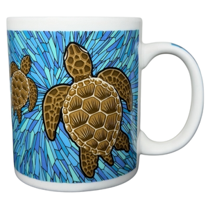 Add a touch of island artistry to your routine with this Honu Glass ceramic mug, featuring beautifully detailed sea turtles gliding across a vibrant mosaic-style blue backdrop. The rich brown shell patterns stand out against the dynamic ocean-toned design, creating a piece that feels both soothing and full of movement. Finished with a clean white handle and rim, this mug captures the signature look of Honu Glass artwork, making it perfect for beach lovers, ocean enthusiasts, or anyone who appreciates handcrafted, coastal-inspired design.