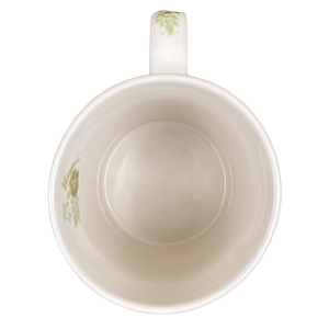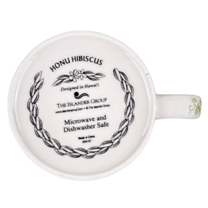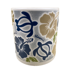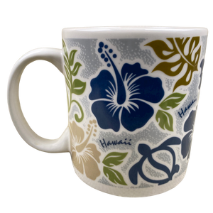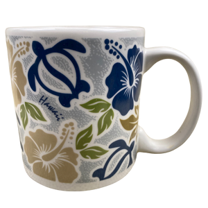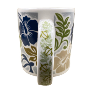 This is a much larger than average mug that features floral and honu artwork wrapping around its exterior surface.