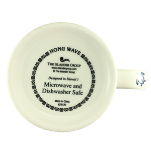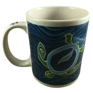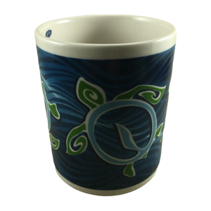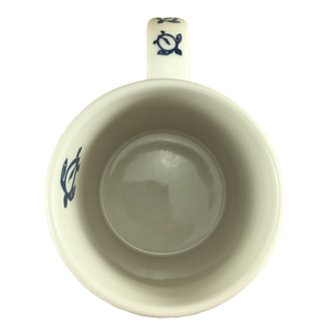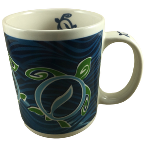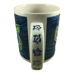 Features images of turtles wrapping around the surface, on the handle and there is also one inside the mug on the rear upper surface.