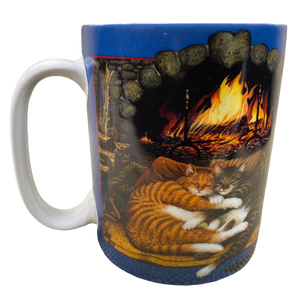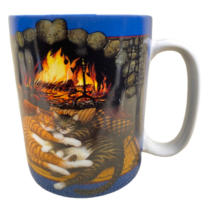 Features the same adorable artwork on its front and rear exterior surface consisting of 2 cats sleeping are in arm together in front of a fireplace.