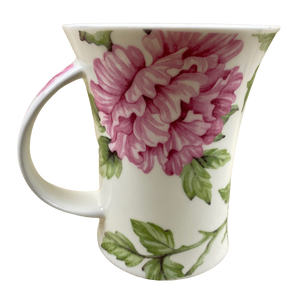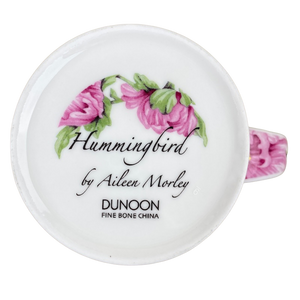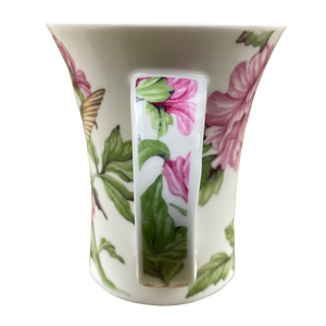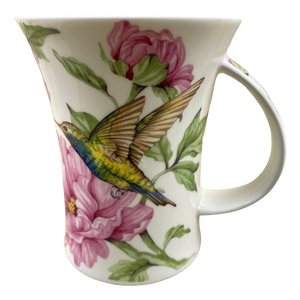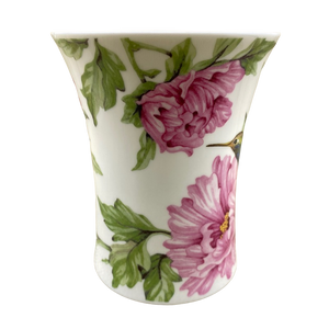 Features gorgeous artwork of a hummingbird among pink flowers wrapping around its exterior surface and on the handle.