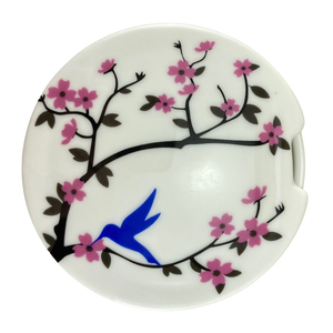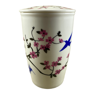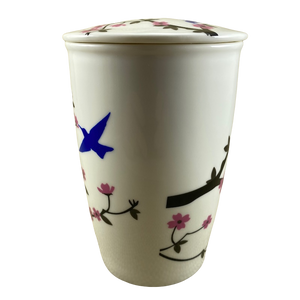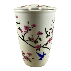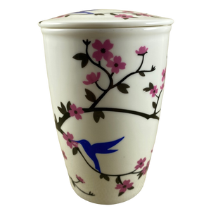 Features floral and hummingbirds artwork wrapping around its exterior surface and on the lid.