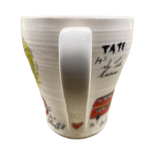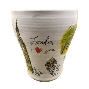 Features artwork wrapping around the exterior surface depicting many things about London.