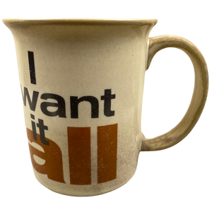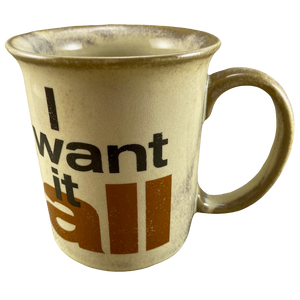 Features the iconic lyric from the 1989 song by Queen on its front surface; "I Want It All."