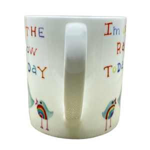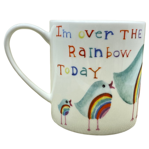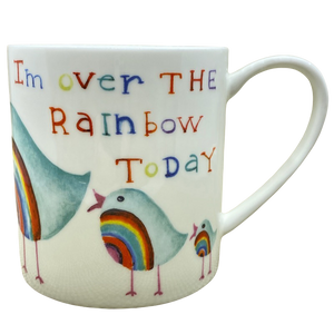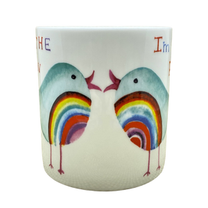 Features the same artwork on its front and rear surface consisting of 3 different sized birds that feature a rainbow pattern to their feathers.