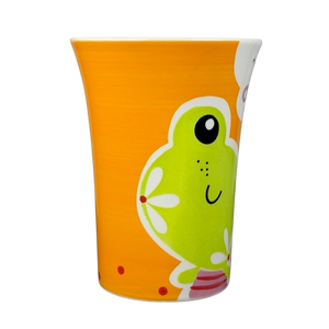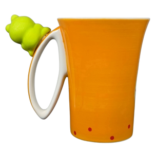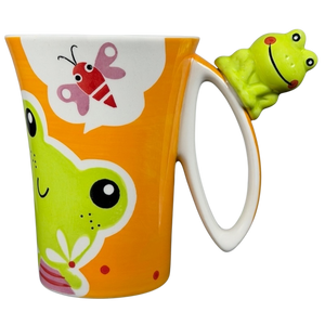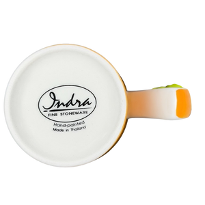 This vibrant Indra Fine Stoneware mug features a playful hand-painted design with a cheerful lime green frog and a red butterfly on a bold orange background. The whimsical nature of the piece is highlighted by a 3D ceramic frog figure perched on the thumbrest of the handle, making it a delightful addition to any collection. Hand-painted in Thailand, the mug offers a high-gloss finish, a clean white interior, and a sturdy construction that combines artistic charm with everyday functionality.
