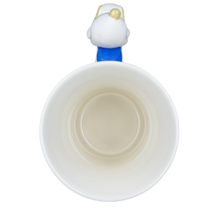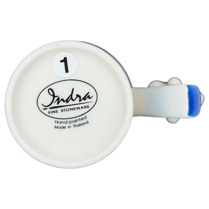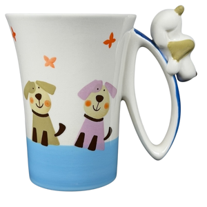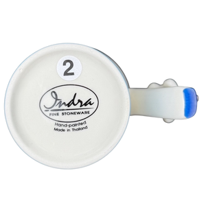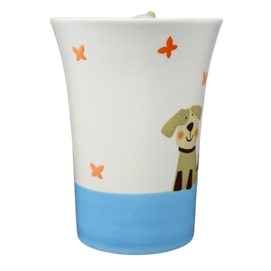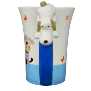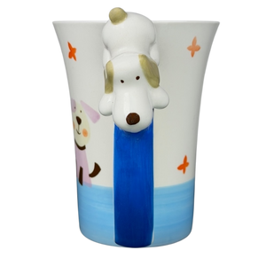 This delightful hand-painted Indra Fine Stoneware mug features a whimsical scene of two charming puppies and floating orange butterflies against a crisp white and sky blue background. The playful design is brought to life by a unique 3D ceramic puppy figure that is expertly perched on the thumbrest of the cobalt blue handle. Meticulously hand-painted in Thailand, this high-quality stoneware piece boasts a glossy finish and a spacious white interior, making it a perfect cheerful addition to any animal lover's morning routine.
