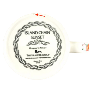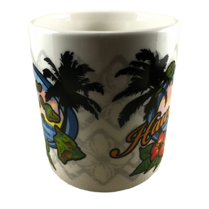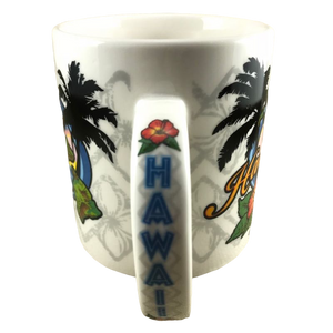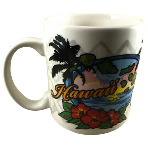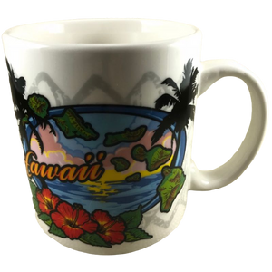 Features the same artwork on the front and rear exterior surface consisting of an ocean scene flanked by palm trees. On the left side "Hawaii" is printed in a cursive font.